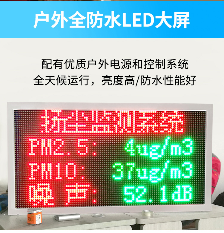 (6)揚塵監(jiān)測設備采用:戶外全防水LED大屏,配有優(yōu)質(zhì)戶外電源和控制系統(tǒng),全天候運行,亮度高/防水性能好。