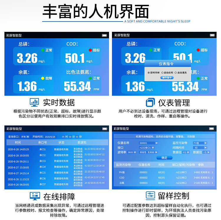 1、定時數據采集、本地存儲及上報平臺 ; 2、整點上報污染源實時數據、分鐘數據、小時數據、日數據 支持本地導出歷史數據 ; 3、支持斷電續傳功能:自動和手動補傳數據 大容量數據存儲空間:提供32MB的內部Flash和外部TF卡數據存儲空間,可存儲10 年以上的采集數據 ; 4、WDT 看門狗設計,保證系統穩定,采用完備的防掉線機制,保證數據終端永遠在線 ; 5、內置市場常見的各種環保儀器儀表和在線監測儀通信協議,用戶通過簡單配置即可正常使用 ; 6、支持串口、APP 等多種配置方式 ; 7、 遠程管理功能:支持遠程參數配置(同時支持平臺配置方式和短信配置方式)、遠程程序升級 提供功能強大的中心管理軟件,方便設備管理(可選)。