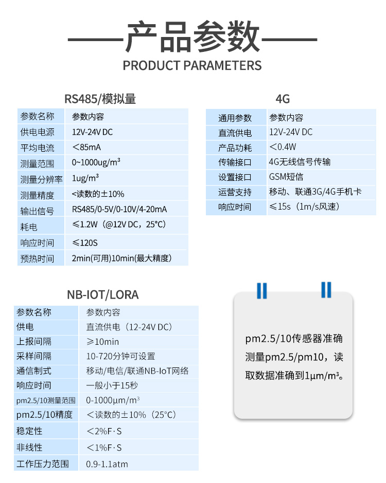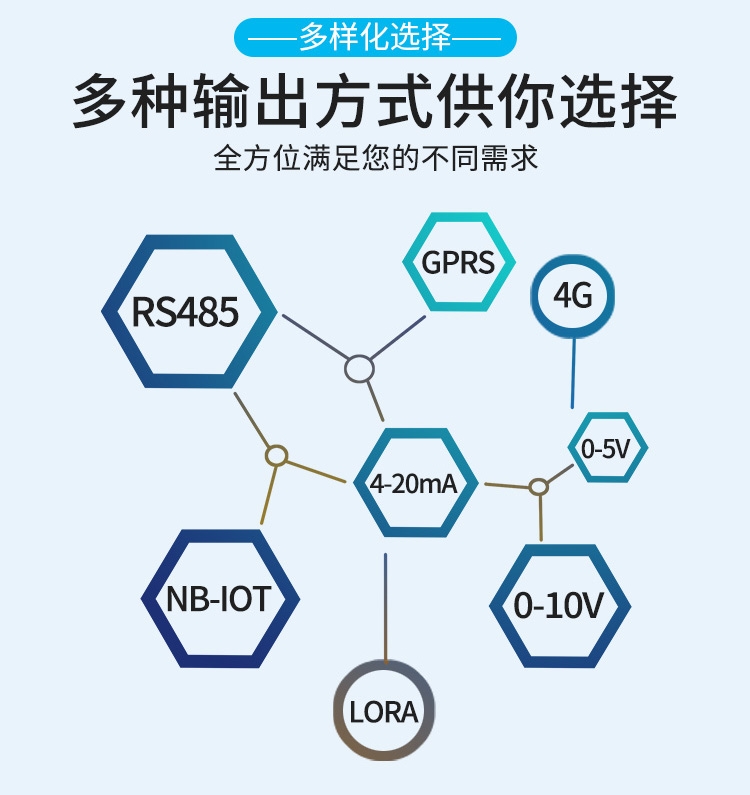 1、顆粒物傳感器輸出信號多樣,支持RS485/4-20mA05V/0-10V/NB-LOT/LoRa/4G等多種信號輸出,滿足不用環境需求。