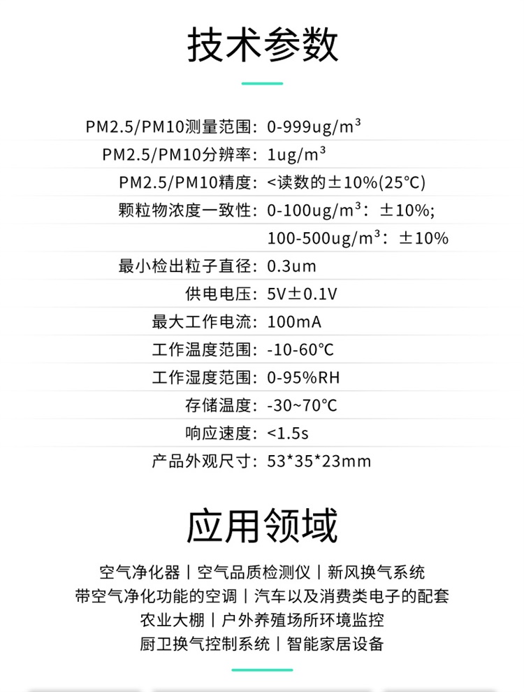 2.可同時輸出PM2.5、PM10、溫濕度、TVOC等數據, 靈敏度高,數據穩定。