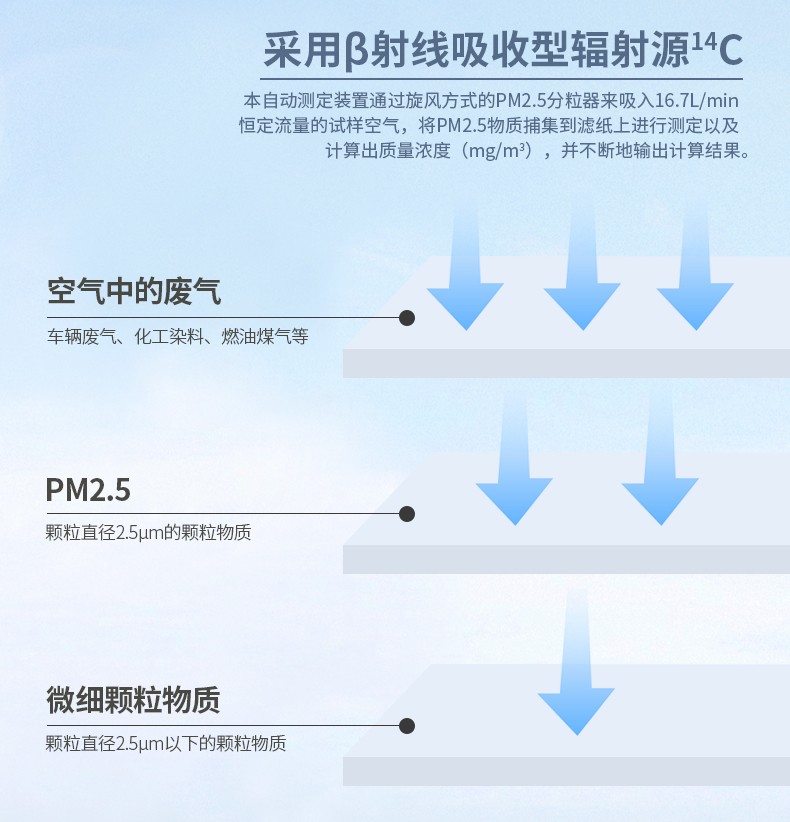 β射線吸收法是利用當低能量的β射線照射到物質上時,β射線的被吸收量與此物質的質量成比例地增加的原理來進行測定的測試方式,用β射線照射捕集在濾紙上的PM2.5物質,通過測定β射線的穿透強度就能夠得知PM2.5物質的質量。