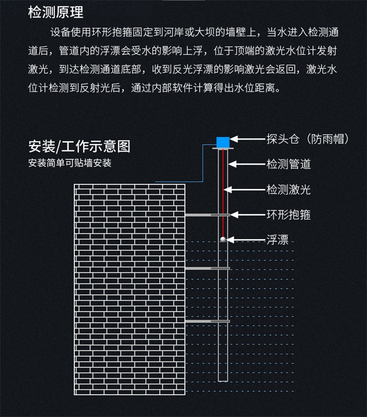 浮球激光水位計使用環形抱箍固定到河岸或大壩的墻壁上,當水進入檢測通道后,管道內的浮漂會受水的影響上浮,位于頂端的激光水位計發射激光,到達檢測通道底部,收到反光浮漂的影響激光會返回,激光水位計檢測到反射光后,通過內部軟件計算得出水位距離。
