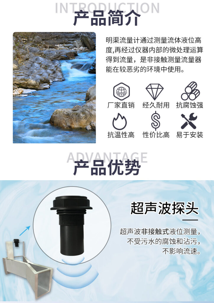 1、超聲波探頭:超聲波非接觸式液位測量不受污水的腐蝕和沾污,不影響流速。
