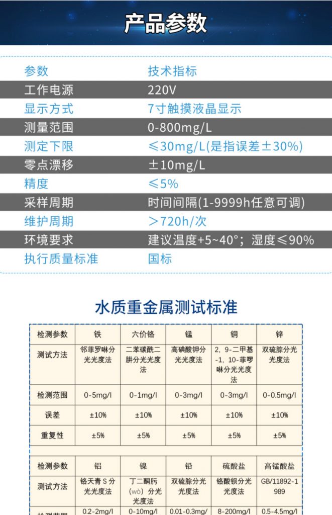 水質重金屬在線分析儀是一款采用分光光度法檢測水中多種重金屬含量的水質監測設備。水質重金屬在線分析儀具有獨特的試劑配方,測量結果準確,采用分光光度法測試各離子的吸光度來檢出水樣中重金屬離子的濃度,可檢測水中鐵、六價鉻、錳、銅、鋅、鉛、鎳、鋁等重金屬離子的含量。該水質重金屬檢測儀可廣泛應用于企業污水、生活污水、地表水、科研院所、造紙印刷冶煉鋼鐵等領域。